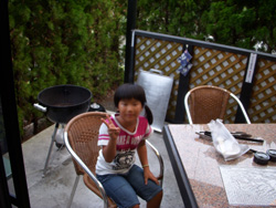 テラスのBBQセット。場所とりをしていたみに〜だが、火の近くなのでママに場所を明け渡した…