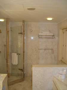 | 大理石のバスルーム。これも、PL法の関係で最近のホテルではまず見られない作りです。 何か、不必要に広い気もするけど、シャワーブースは大いに助かりました。 |
