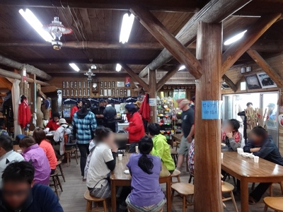 カレーとお茶。一昨年と同じでした 19:00前後の食堂はご覧のにぎわい。山室には次から次へと登山客が到着し、賑やかなのか静かなのかわからない状況ですが、私の頭が痛くなってきたので、確実に空気が薄くなっているのはわかります。実際、外に出ると少し楽になりました……が、さすがに冷え込んでいるため、20:00の消灯ギリギリまで食堂に座っていました。傍らではスタッフの方が賄いの食事をしていました。