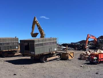 浅間大社は工事中で、御幣のみ飾られていた ブルドーザーが資材を運び上げ、廃棄物を下ろしていた 浅間大社の左側から剣ヶ峰を望む。