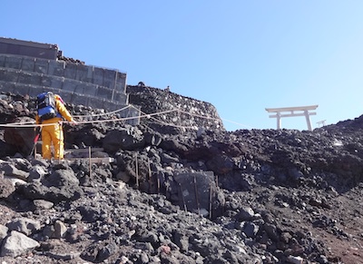 6:45出発。ここからが本当に苦しいのはわかりきっているし、ゆっくりでも進んでいれさえすれば必ず登頂できます。八合目付近と違って登山道は緩やかです。息を切らさないように丁寧に登っていると、前の方にゆっくり進む年配のご夫婦がいたので、後をついていく形で無事鳥居をくぐりました。